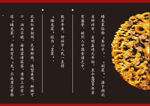 蟠龍菜創(chuàng)于湖廣安陸州(今湖北鐘祥市),鐘祥地區(qū)人們逢年過節(jié)、婚喪嫁娶離不開的傳統(tǒng)名菜,被列入中國食譜之中,是鐘祥地區(qū)名優(yōu)土特之一。公司多年來保留古法工藝精髓,致力于生產(chǎn)、加工、改進(jìn)蟠龍菜,產(chǎn)品得到市場的一致好評與肯定。
